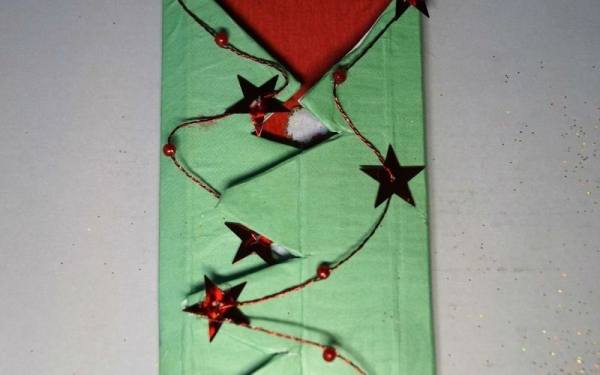 С лицевой стороны половинки-елочки мы украшаем декоративными звездочками. На самом деле это металлическая проволока и ее можно гнуть, как хочешь, однако на обычный клей она не «сядет», поэтому мы ее закрепили на термоклей.
