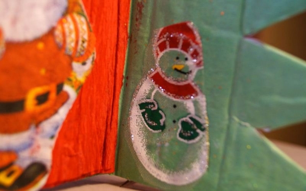 По боковым сторонам открытки приклеиваем с помощью ПВА вырезанных из декоративной ленты снеговичков, а сверху крепим снежинки.