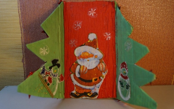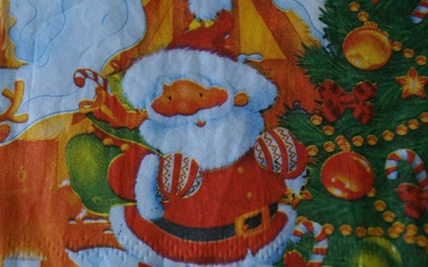 Теперь вырезаем и приклеиваем на пустой прямоугольник красную бумагу. Из салфетки аккуратно вырезаем нужный рисунок, в нашем случае это Санта-Клаус. К сожалению, салфеток с Дедом Морозом я не нашла у себя, поэтому пришлось довольствоваться этим рисунком. Вырезанную фигурку клеим в середину нашей открытки.