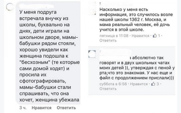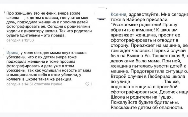 Фейк часто распространяется со словами «это рассказала мама одноклассницы моего ребенка», «сообщила учительница из нашей школы», «это было в школе No…», «прислали из полиции», «у знакомой муж работает в полиции, и он рассказал…». В комментариях к сообщению про женщину, которая просила сфотографировать ее с кустами, взрослые люди ссорились друг с другом, доказывая, что описанный эпизод произошел именно в их школе, причем делали это довольно агрессивно. Ссылка на подругу/мужа/полицию/завуча или просто безапелляционно заявление «это было в нашей школе» не доказывает достоверность истории.