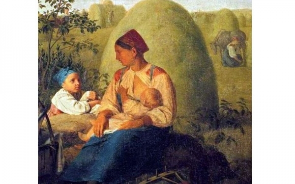 На фоне изображено не просто поле – идет уборка сена, то есть художник показывает нам сценку из крестьянского быта. Кормление младенца – такая же часть жизни крестьянки, как труд. Нет конфликта между тем, что она держит малыша у груди, и тем, что происходит вокруг нее. Венецианов создает впечатление единства и гармонии.