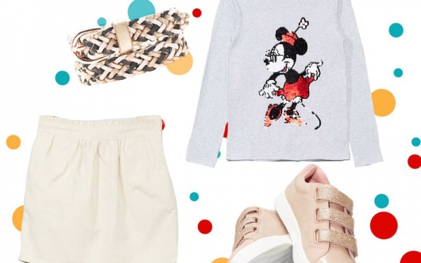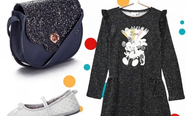 Платье с блестящими нитями и влюбленными Микки и Мини Маус — уместный и нескучный наряд для похода в театр. Не забудьте про аксессуары: какой светский выход без сумочки с блестками?