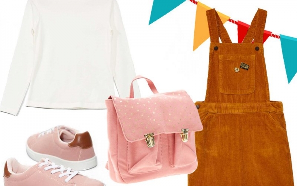 Платье-комбинезон 1 100 рублей, водолазка 250 рублей, кеды 990 рублей, портфель 900 рублей.
