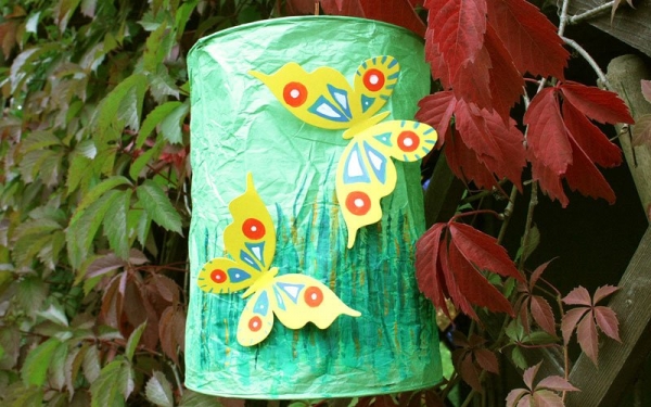 Готовому абажуру сделаем крепление из прочной нитки. Теперь фонарик можно повесить в саду или в доме, и пусть он создает радостное настроение.