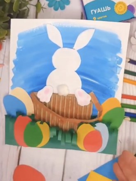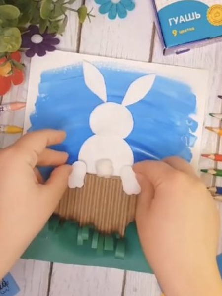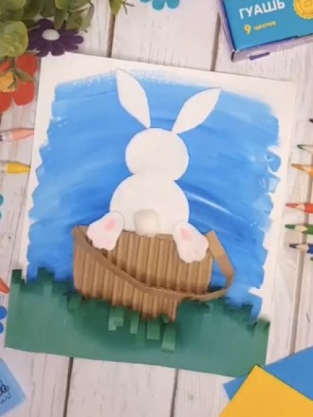 4. Вырежьте зайку, приклейте его в корзинку и скатайте из ваты хвостик.
