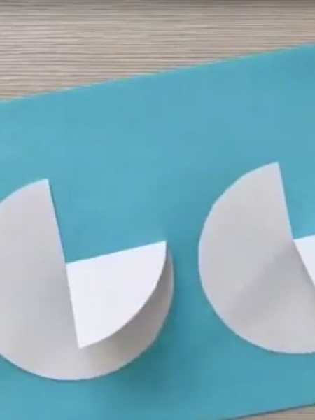 4. Вырежьте два белых круга, сделайте на каждом надрез от края до центра, загните четвертинку. Остальные три четверти приклейте на второй голубой фон.