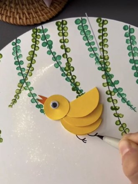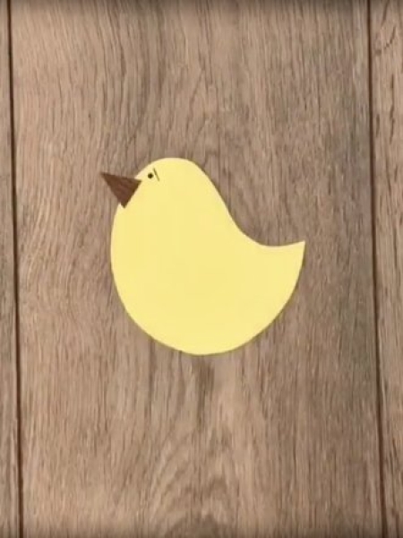 3. Сделайте из желтой бумаги цыпленка, приклейте ему клюв из коричневой бумаги и нарисуйте глаз.