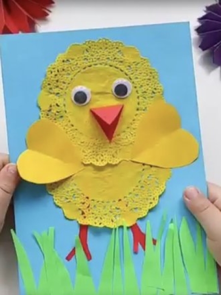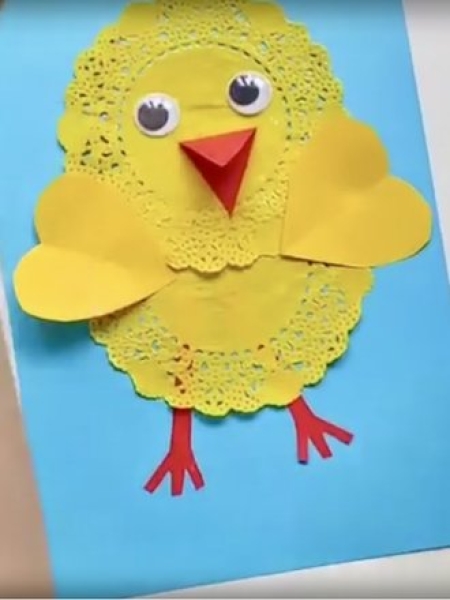 Если у вас дома есть ажурные бумажные салфетки, можно сделать из них милого цыпленка.