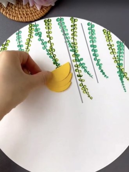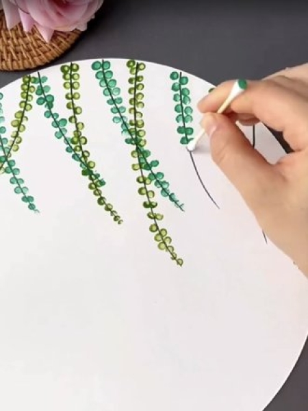 2. Добавьте на веточки листочки зеленой и темно-зеленой краской с помощью ватной палочки.