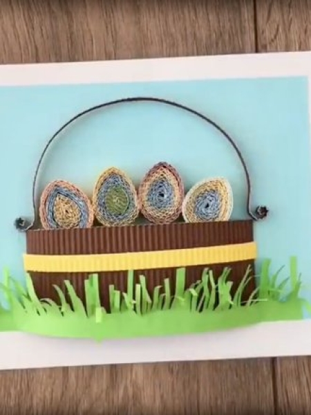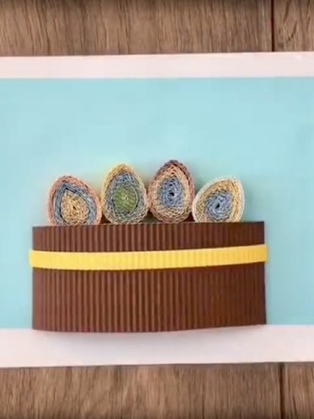 5. Приклейте прямоугольник коричневого картона, оставив пространство внутри. На корзинку добавьте желтую полоску, а сверху яйца.