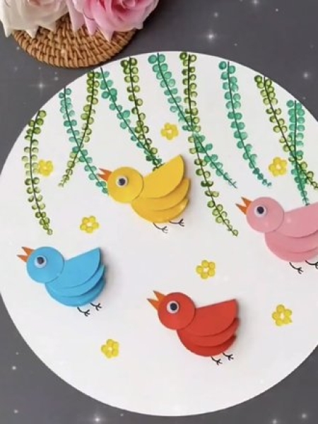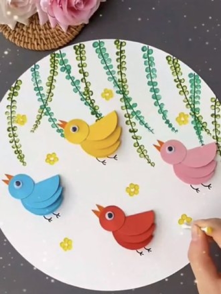 5. Сделайте таким образом еще три птички. Дорисуйте с помощью ватной палочки желтые цветочки.