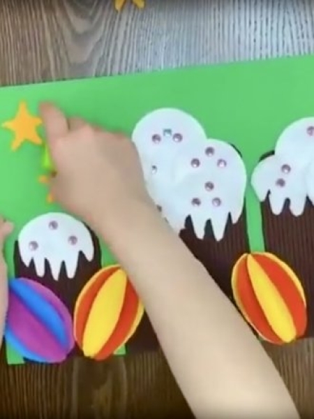 3. Вырежьте из картона куличи разной высоты, наклейте на зеленый фон.