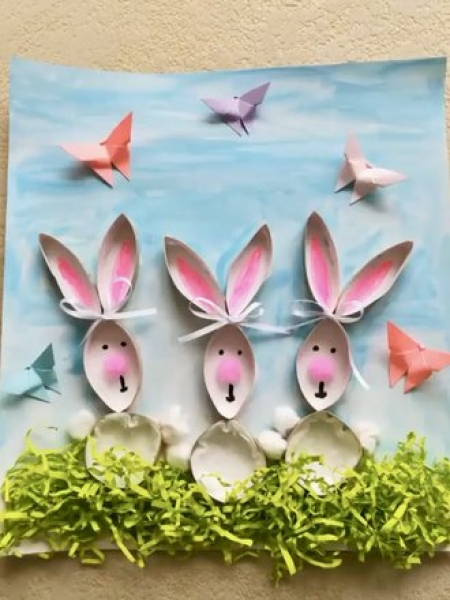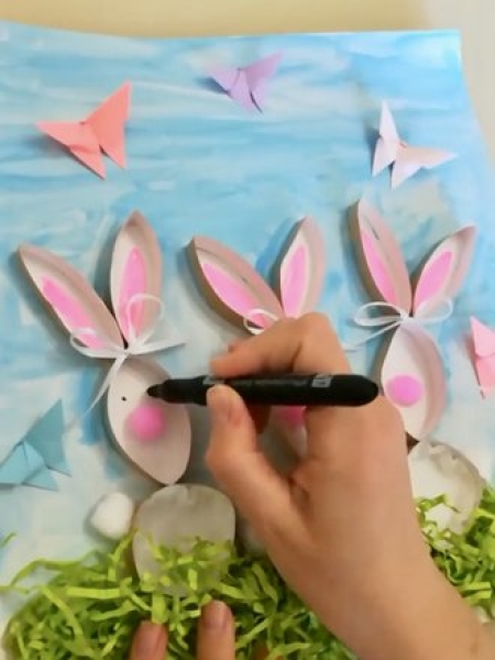 5. Из ваты скатайте лапки и носики зайцам, нарисуйте глаза, раскрасьте ушки розовым фломастером. Можете добавить бумажных бабочек.