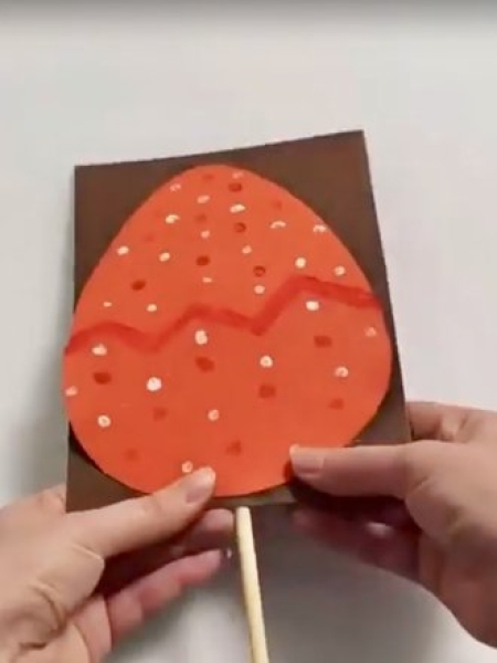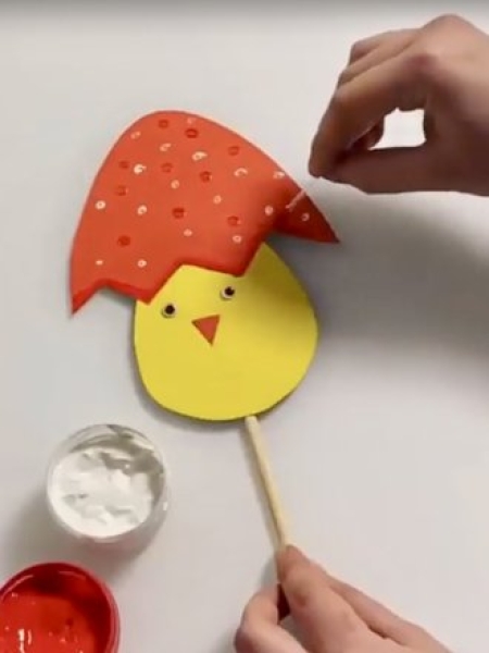 4. Верхнюю часть яйца украсьте горошком из белой и красной краски, поместите ее на голову цыпленку. Сделайте ему глаза и клюв и приклейте на палку.