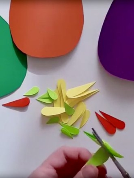2. Из цветной бумаги нарежьте лепестки, сложите их пополам.
