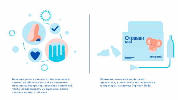 Большую роль в защите от вирусов играет слизистая оболочка носа и ее защитные механизмы (например, ворсинки эпителия). Чтобы поддерживать их функцию, важно следить за чистотой носа ребёнка. Это необходимо делать ежедневно, и даже несколько раз в день – при насморке, когда гигиена носовой полости становится ещё и частью лечения.