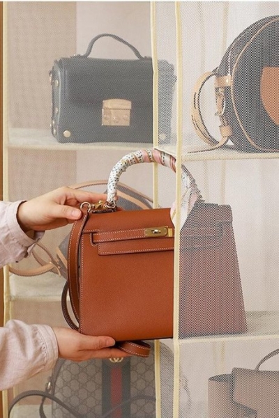 Почему пригодится: Если вешать сумку рядом с верхней одеждой, ремень деформируется, на коже и фурнитуре появляются потертости и царапины. Сохранить внешний вид аксессуара поможет специальный органайзер. В нем достаточно пространства и сумки защищены от пыли и прямых солнечных лучей. При этом сама конструкция не займет много места в гардеробном шкафу.