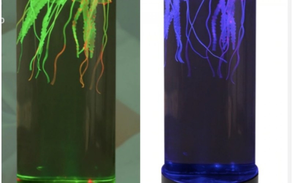 - Упакована нормально, светильник пришел целым, в работоспособном состоянии. Представляет трубу из оргстекла с подставкой. Принцип работы простой: в подставке светодиоды и моторчик с пропеллером, который создает водяные потоки, он включается и тащит медуз вниз, и выключается — они снова всплывают.