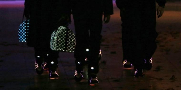Одним из главных хитов показа мужской коллекции Louis Vuitton FW19 стали черные сумки, украшенные классической разноцветной светящейся монограммой бренда