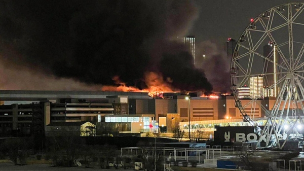 Московская область. Красногорск. Вид на горящую крышу концертного зала «Крокус Сити Холл».