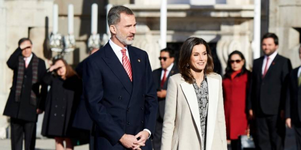 Королева Летиция вместе с супругом провели официальную встречу в королевском дворце. Для выхода монаршая особа выбрала образ в постельных тонах, сделав акцент на туфли